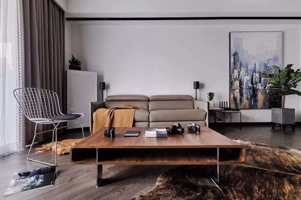 客廳,深色地板和水泥墻,突出了工業風的元素。水泥墻電視背景給生活帶來真實感,簡簡單單、不加修飾,實則蘊藏著與生俱來的原始美感。